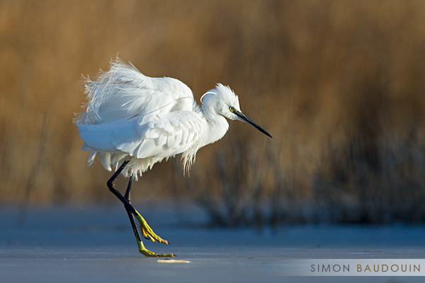 7h45, les premier signes de vie commencent à se faire entendre, un râle d’eau crie à proximité, une première aigrette se pose sur la glace et commence à pêcher sur le bord dégelé de la roselière. La lumière est encore trop faible, j’attends. Je constate qu’il ne me reste plus que 38% de batterie… merde… j’ai oublié de les recharger…