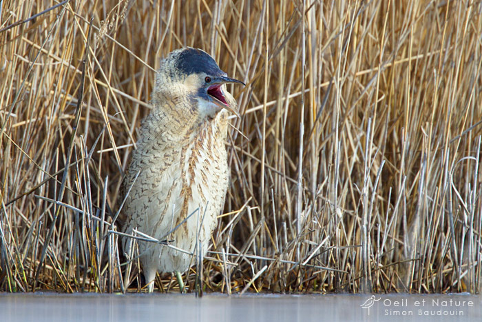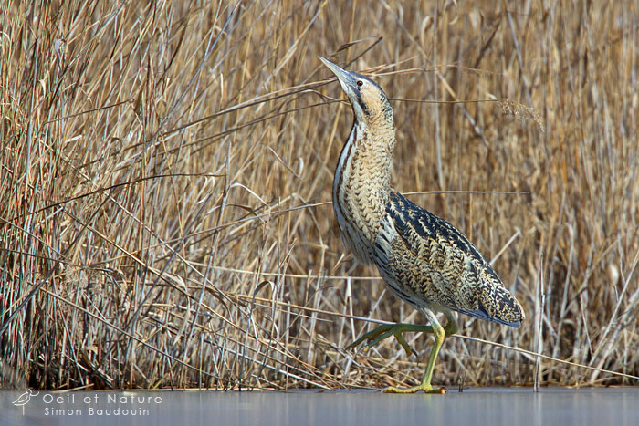 11h00. Je l’attendais plutôt sur la droite et il est arrivé sur… la gauche… Le butor ! Je vais rester pendant plus d’1h en sa compagnie, un vrai régal pour les yeux de pouvoir l’observer sans être vu. Cela faisait plus de 5 ans que je lui courrais après en espérant faire des photos dans ces conditions. C’est chose faite !