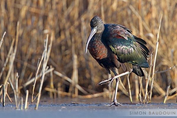 8h30. Deux ibis falcinelles viennent se mêler à la petite troupe d’aigrettes qui compte 9 oiseaux maintenant. Restant ensemble, ils recherchent quelques petites larves aquatiques à se mettre sous le bec en se frayant un chemin entre les brins de roseaux.