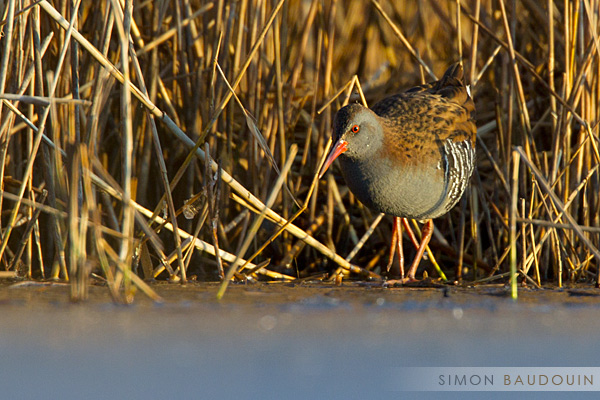 8h05, une belle lumière orange inonde la roselière et le râle d’eau daigne sortir à découvert.